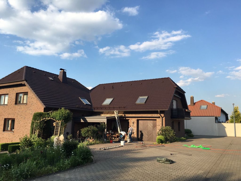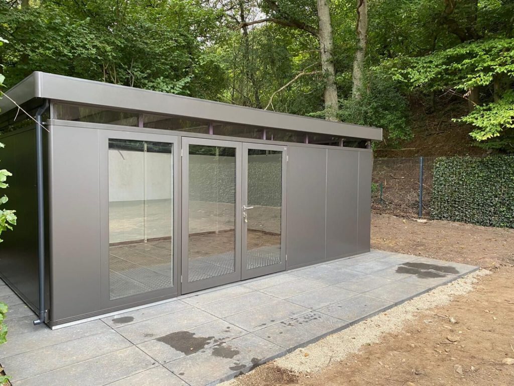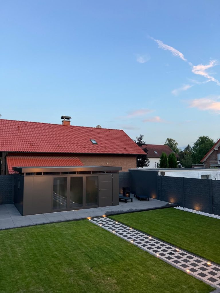 Dachbeschichtung, Biohort Sauna Haus, Betonzaun, Terassenplatten, Rollrasen, Wegplatten & Beleuchtung – alles aus 1. Hand