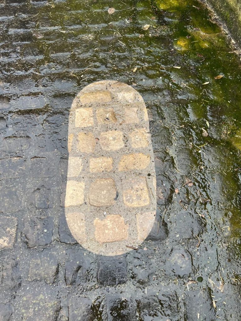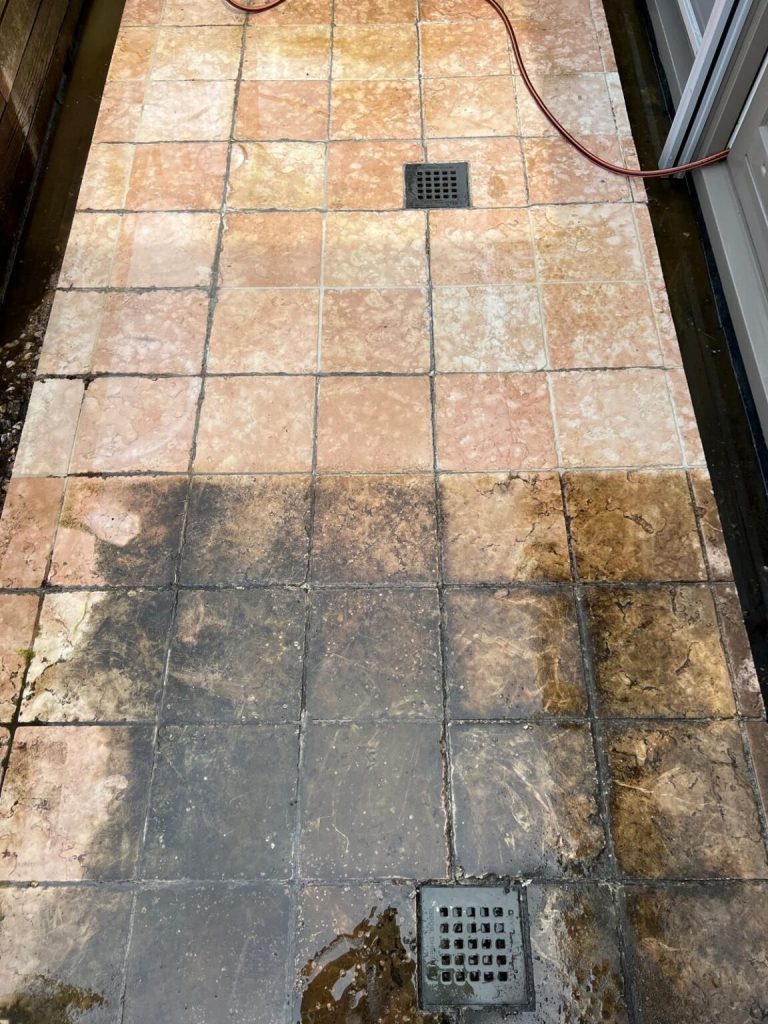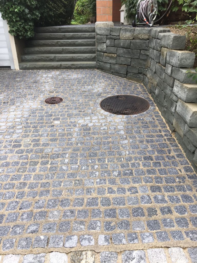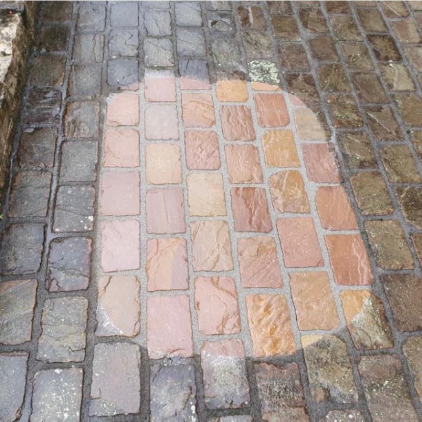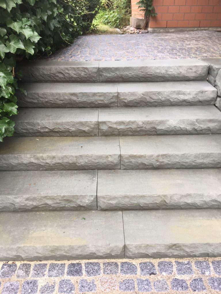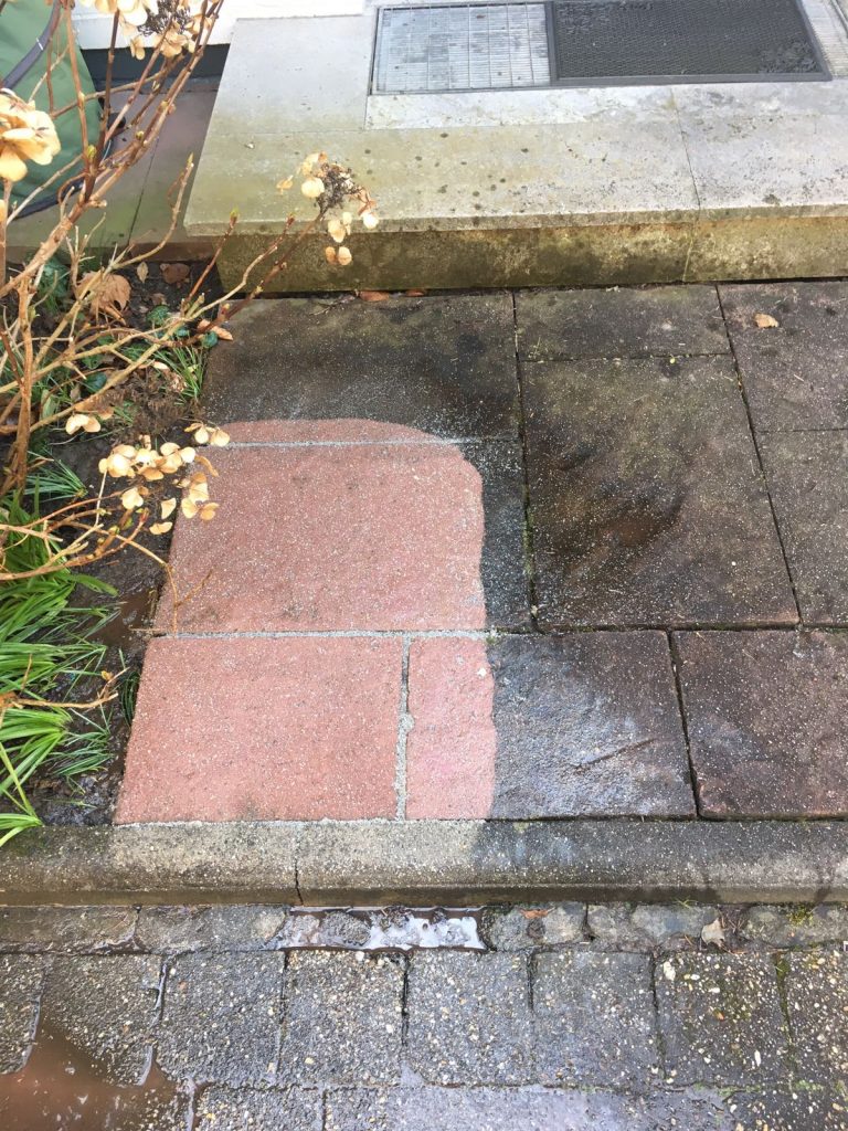 Porphyrsteinplatten vorher mit starker Verschmutzung / nachher Gereinigt & mit Silikonharzimprägniert